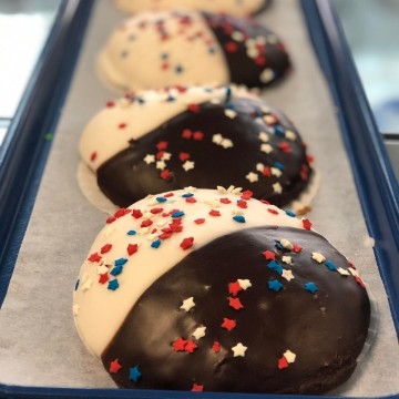 Choose your filling. Comes garnished with chocolate chips and powdered sugar.