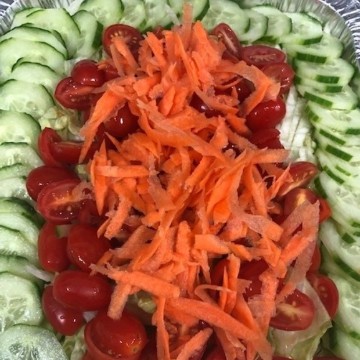 <p>Chopped Iceberg Lettuce with sliced Cucumber, Shredded Carrot and Grape Tomatoes</p>