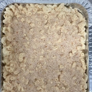 Elbow Macaroni in a creamy Cheddar sauce topped with Bread Crumbs.